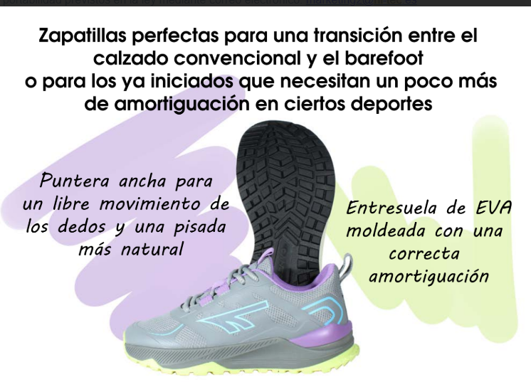 Transición segura al barefoot: Su horma ancha favorece una pisada más natural, fortaleciendo gradualmente tus músculos y mejorando tu técnica de carrera, mientras la amortiguación EVA proporciona la protección necesaria durante el período de adaptación.